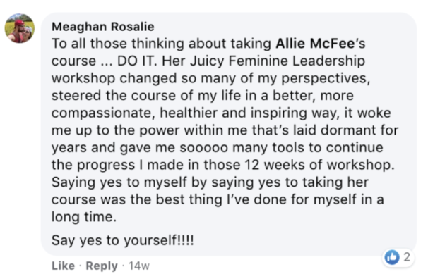 âPlaying and pleasuring our way into deeper self love, embodiment and abundance while forming deep sisterhood bonds... it doesn't get much better than that! This space is absolutely transformational. Numana- Allie has designed a program that is not only incredibly informative and leading edge but also SO FUN and nourishing! I highly recommend this program to any and all womxn ready to connect to the pleasure that is their birthright and return home to their divinely feminine nature."